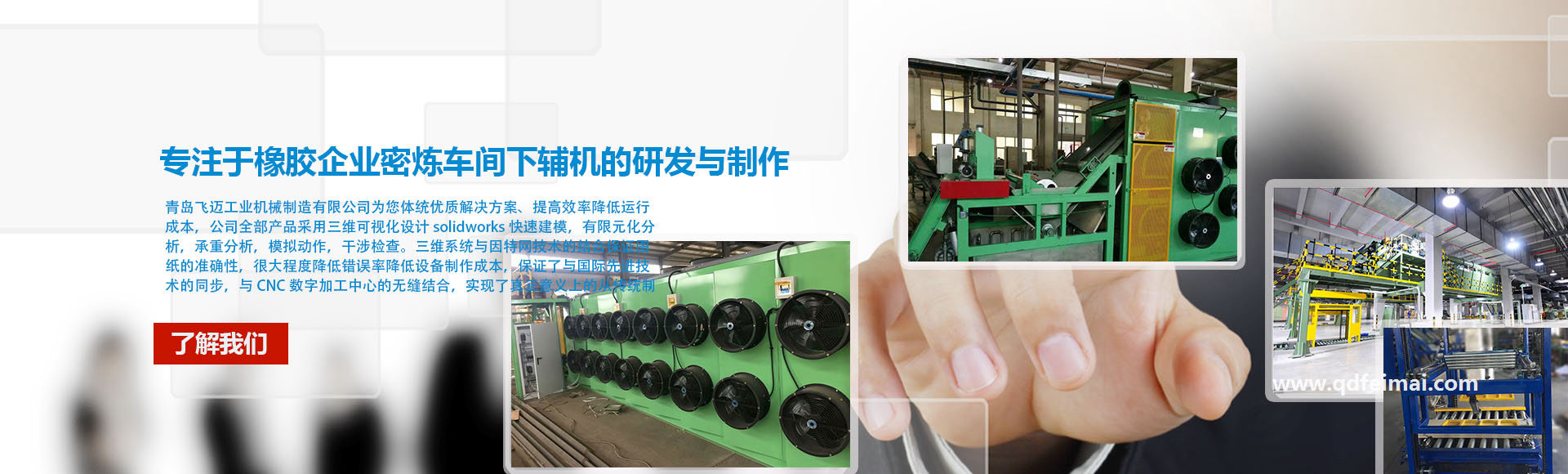 青島飛邁工業(yè)機械制造有限公司坐落于青島市,成立于2012年,注冊資金200萬人民幣,我們專注于橡膠企業(yè)密煉車間下輔機的研發(fā)與制作、并擁有自營進出口權(quán)。